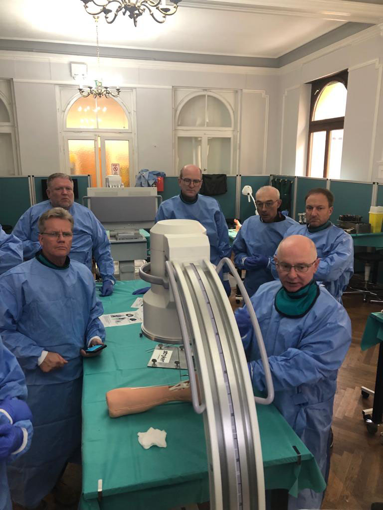 Mr Taylor can be seen demonstrating the surgical techniques using an ankle replacement model, including placement of guide wires and use of the image intensifier, to confirm that correct alignment of the implant is achieved.